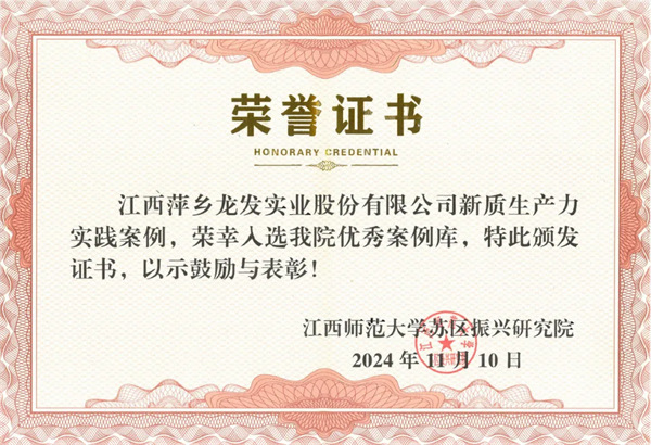 龍發(fā)實業(yè)新質(zhì)生產(chǎn)力實踐案例榮幸入選江西師范大學(xué)蘇區(qū)振興研究院優(yōu)秀案例庫2024/11/11