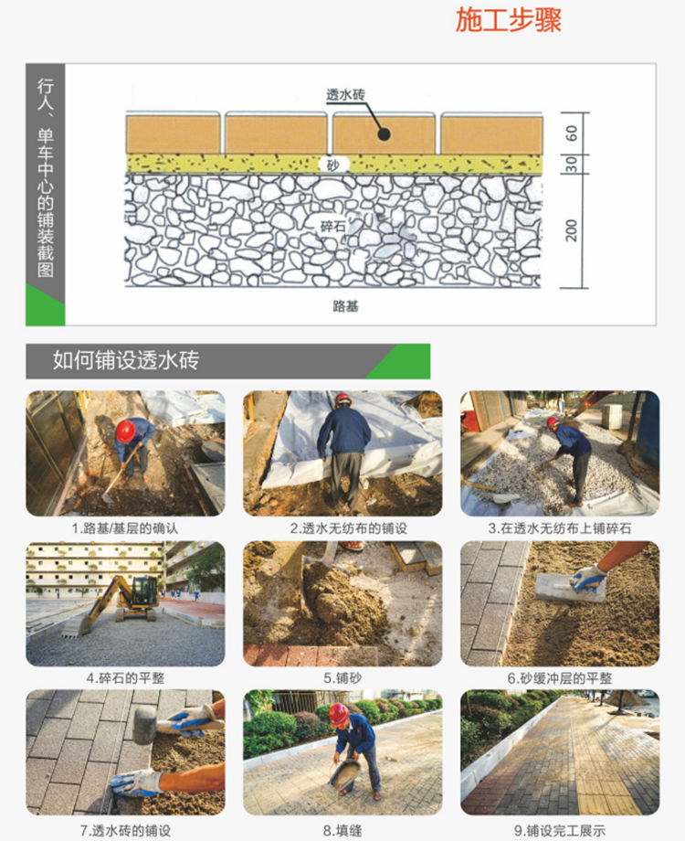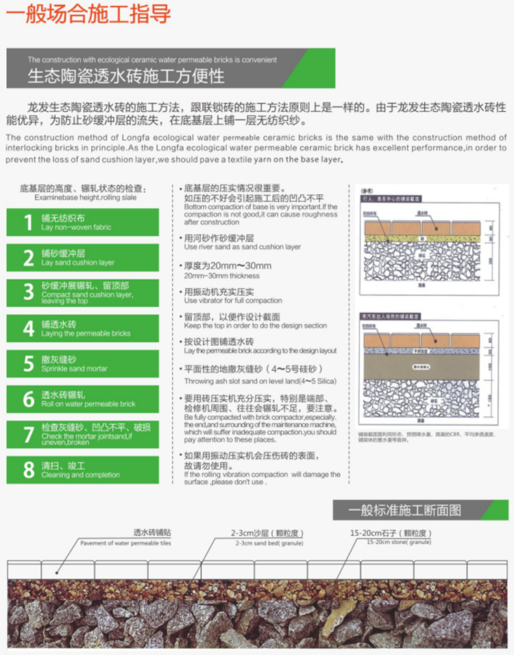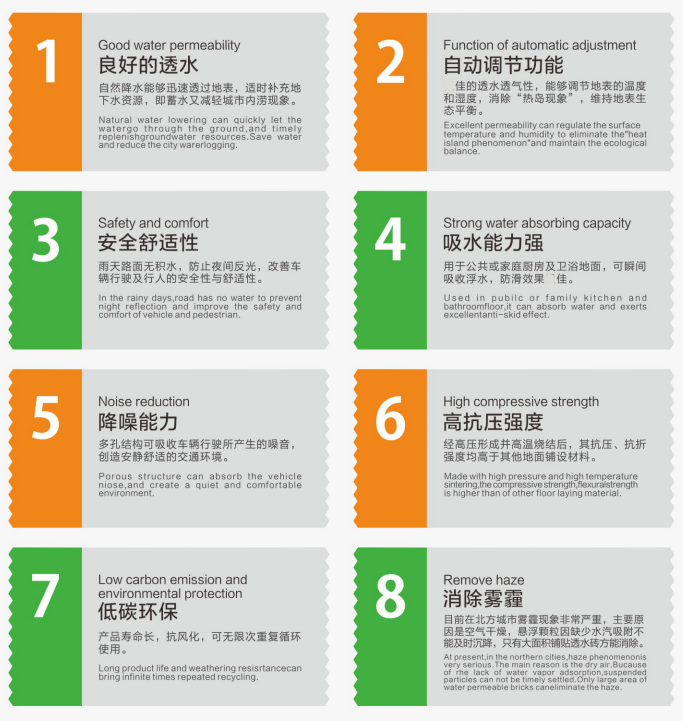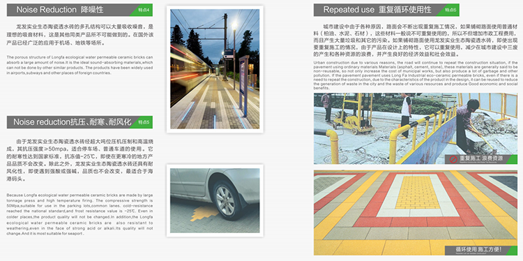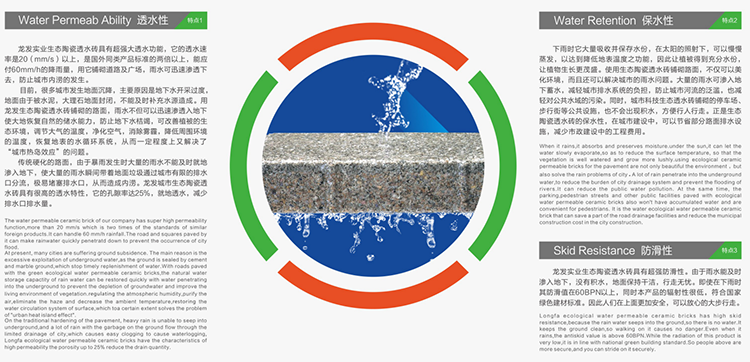 該生態(tài)陶瓷透水磚取材于廢瓷磚及廢棄陶瓷、煤矸石等廢舊物資,可廣泛用于公共建筑廣場,城市道路、地鐵、車站、別墅、住宅、公園、藝術景觀、廚衛(wèi)空間等場所,具有保持地面的透水性、保濕性、抗壓、防滑、高強度、抗寒、耐風化、降噪、吸音、可重復使用等特點,產品經測試中心檢測,各項性能指標均已達到或超過國內外同類產品,可有效緩解“城市熱島效應”,為恢復城市地面透水性,提高空氣質量,消除霧霾,助力海綿城市建設,建設生態(tài)家園貢獻一份力量。